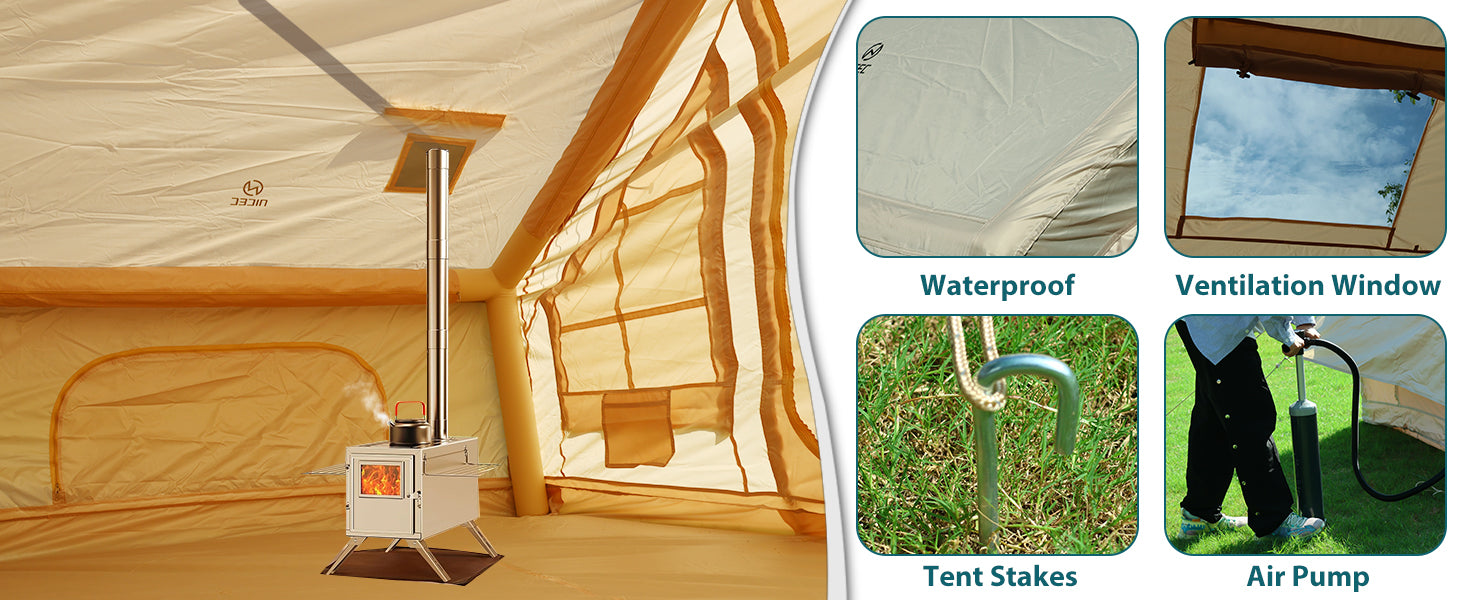 🌧 Weather-Resistant & Stove Ready: Waterproof materials, wind ropes, and chimney port for safe cold-weather camping.