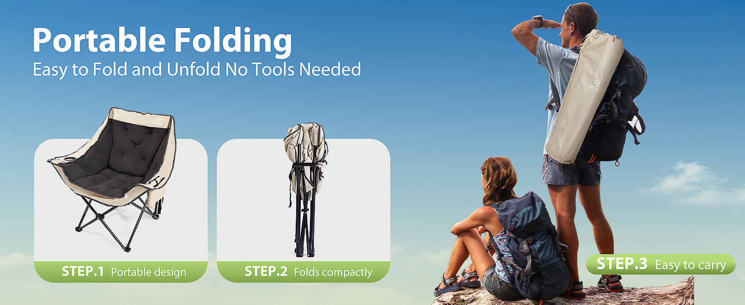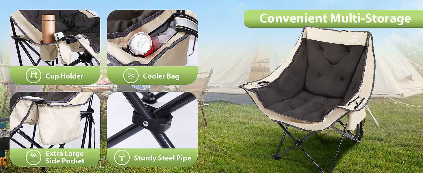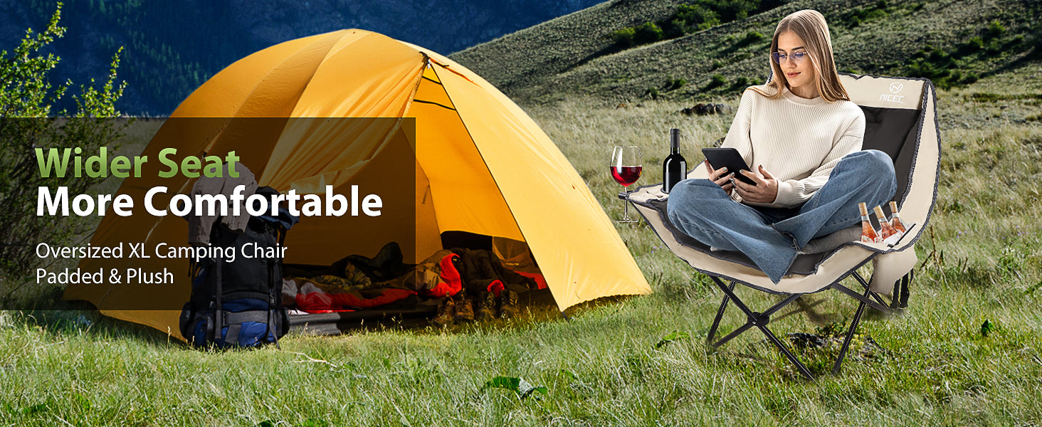 The chair features thick plush padding and an oversized seat, providing ultimate comfort for extended sitting during camping, picnics, or backyard events.