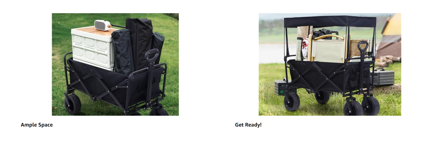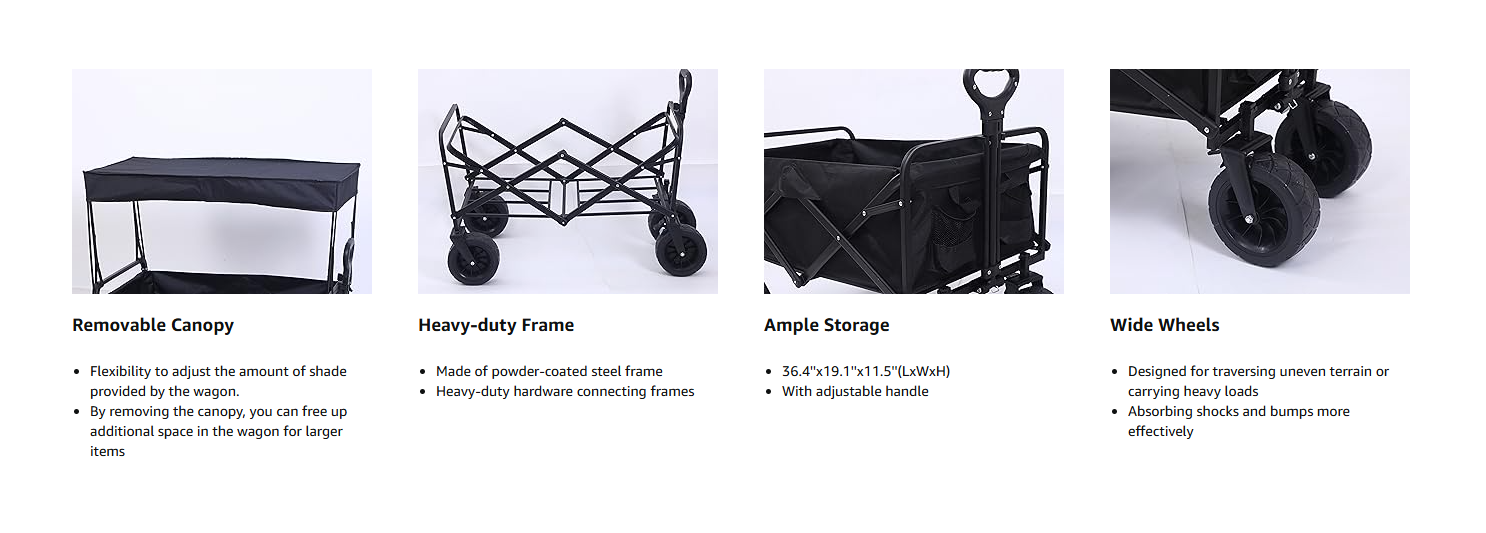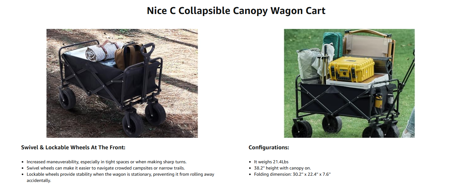 This Nice C Heavy Duty Wagon is a versatile and portable cart designed for convenience. Its standout features include a removable canopy for sun and light rain protection, an adjustable ergonomic handle for comfortable pulling, ample storage with side pockets and cupholders, and an enhanced safety brake for stability on slopes. It folds down compactly for easy transport and storage. It's ideal for a variety of outdoor activities such as beach trips, picnics, camping, sporting events, festivals, gardening, or even for transporting kids and pets comfortably.