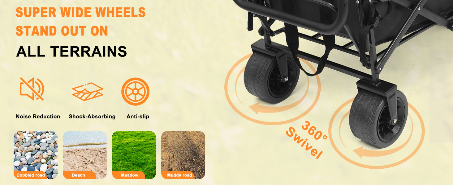 ๐ All-Terrain 360ยฐ Wheels โ Smooth, quiet movement on sand, grass, or pavement with front brake for stability.