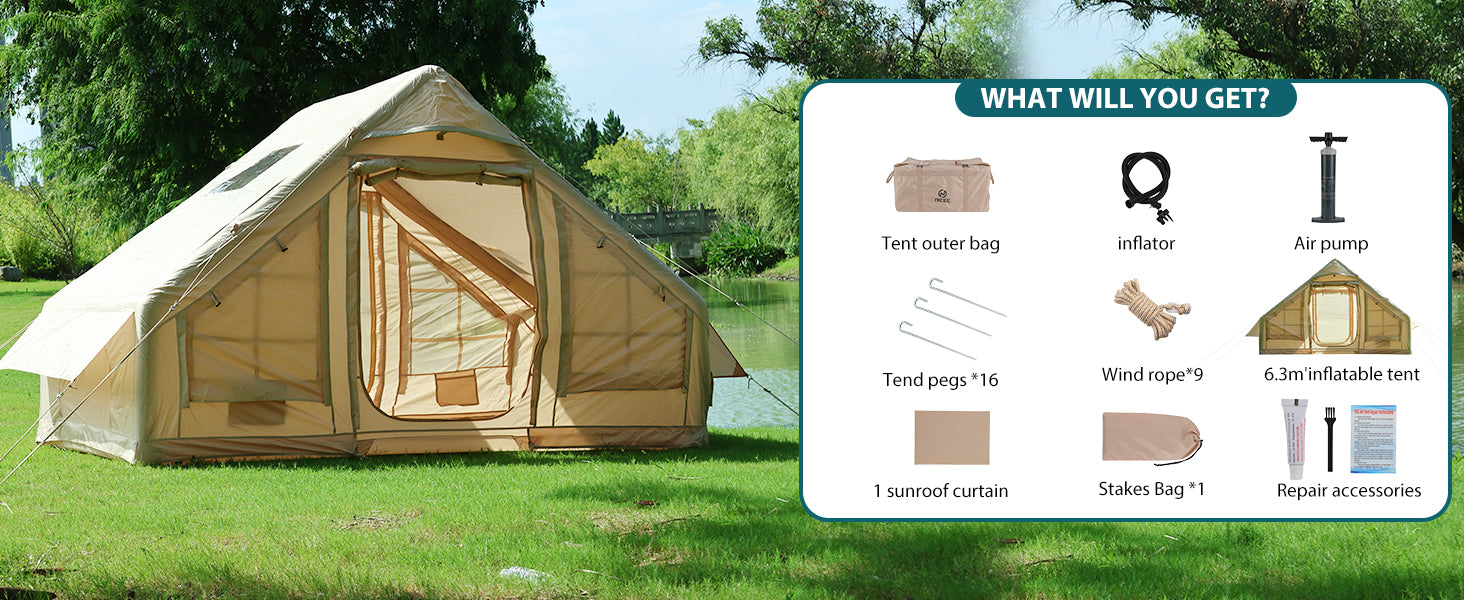🎒 Complete Package: Tent bag, air pump, inflator tube, tent pegs, wind ropes, sunroof curtain, stakes bag, and repair kit included.
