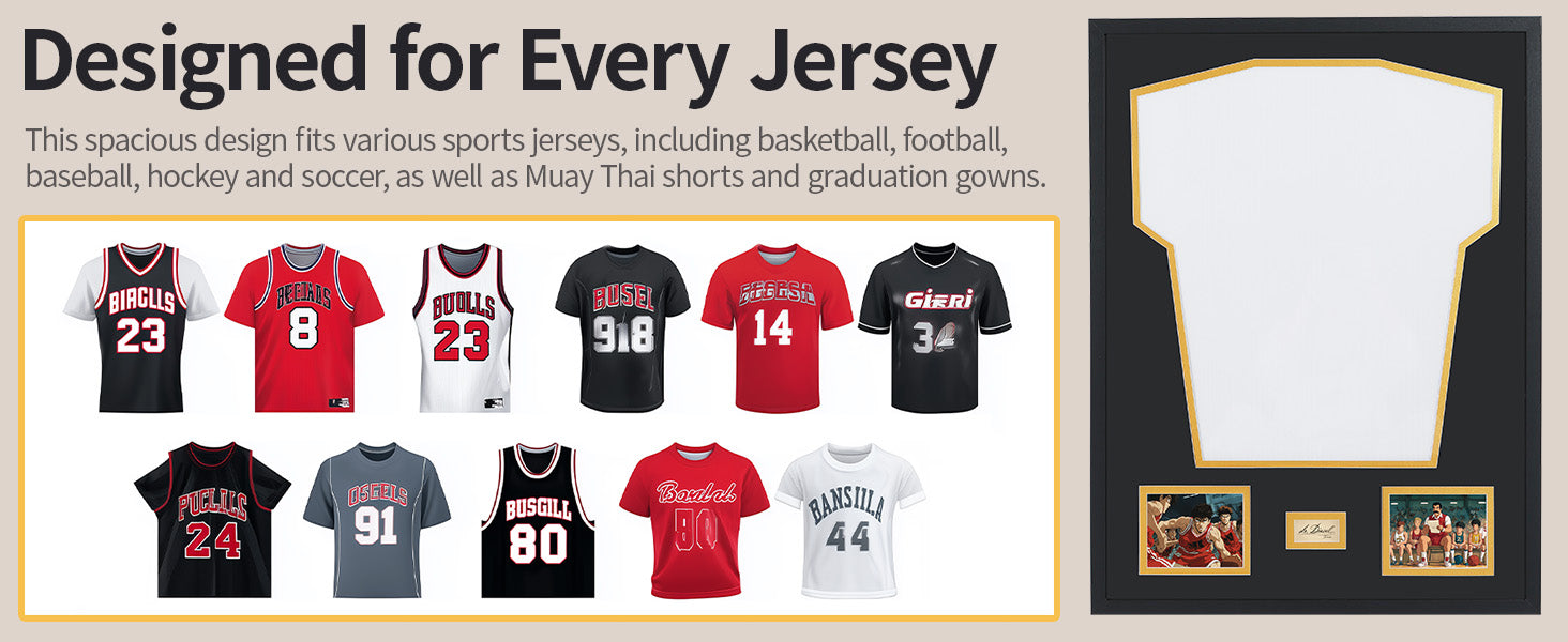 The inner display area measures 21.54" x 19.49" (54.7cm x 49.5cm), designed to perfectly fit standard adult-sized jerseys from most sports. For oversized or youth jerseys, they can be neatly folded or arranged to create an ideal fit within the frame.
